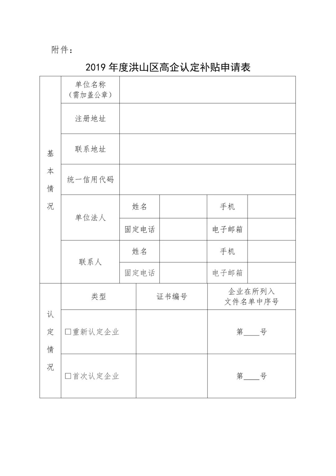 一、申报对象 洪山区2019年度通过高新技术企业认定(首次认定、重新认定)的企业,且企业目前税务关系必须在洪山区。 二、申报要求 三、注意事项 请于5月21日之前将纸质版申报材料(一份)报至洪山区科经局,地址:洪山区文化大道555号融创智谷C5栋附楼413室。同时将电子版申报材料(PDF)发至邮箱:48502339@qq.com,纸质版申报材料须与电子版申报材料一致。纸质申报材料用A4纸打印。申请表提交签字盖章原件,复印件无效。 四、联系方式 附件:2019年度洪山区高企认定补贴申请表 洪山区科学技术和经济信息化局 2020年5月15日